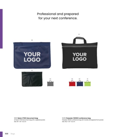 A4 Nylon (70D) document bag with a zippered pocket. Polyester (600D) conference bag with handle and zippered front pocket.